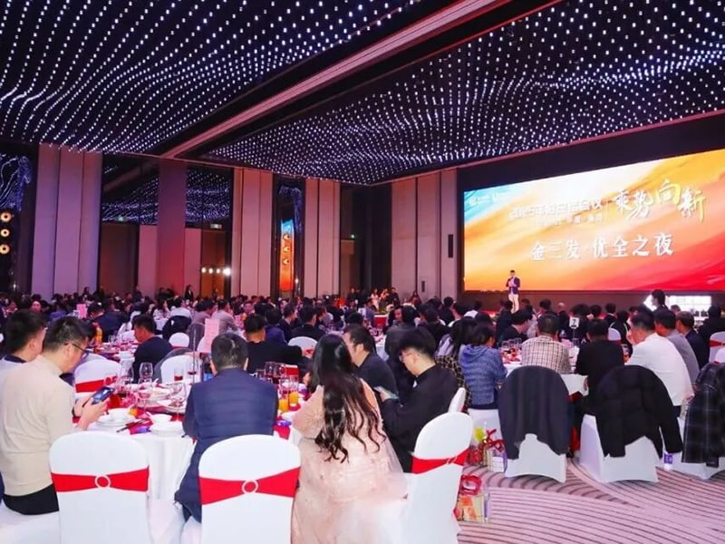 “金三发之夜”主题晚宴温情举行。副董事长严峻致辞感谢。董事长严华荣及夫人与各事业部总经理共同举杯致敬奋斗者。